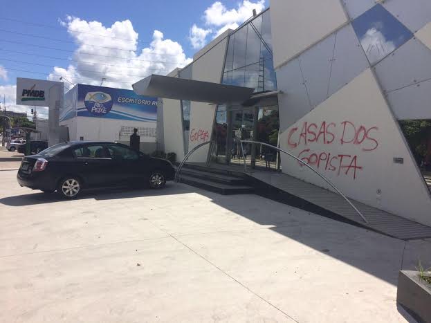 “Urgente, hoje por volta das 18:00 horas, os vândalos do PT picharam novamente a sede do PMDB Estadual, e, ainda, quebraram os vidros da entrada central”, divulgou Antônio Souza pelas redes sociais.