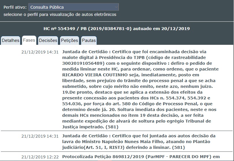 O ministro Napoleão Nunes Maia Filho, do Superior Tribunal de Justiça (STJ), ordenou a soltura imediata do ex-governador Ricardo Coutinho (PSB), que se encontra recolhido à Penitenciária Média de Mangabeira, envolvido na Operação Calvário, acusado como chefe de uma organização criminosa especializada em desvio de recursos públicos da saúde e da educação. Também foram beneficiados com a decisão os investigados Francisco das Chagas Ferreira, David Clemente Monteiro Correia e Cláudia Veras.