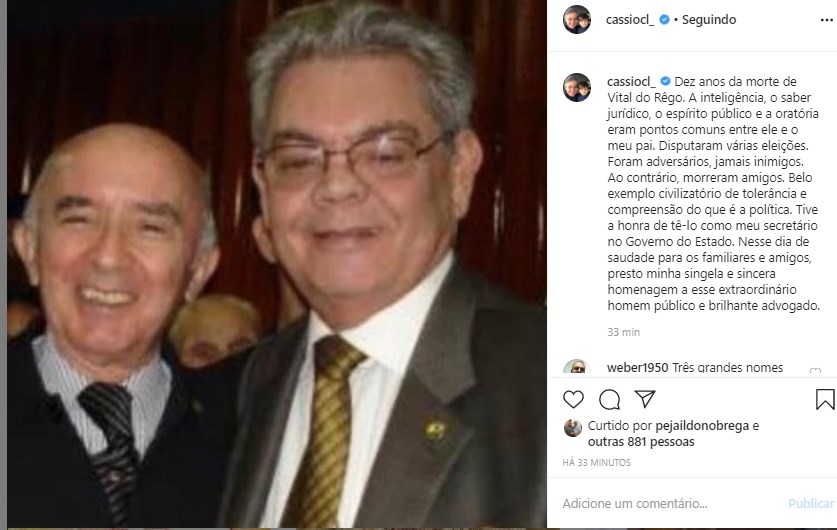 Junto com a foto, Cássio escreveu o seguinte texto: “Dez anos da morte de Vital do Rêgo. A inteligência, o saber jurídico, o espírito público e a oratória eram pontos comuns entre ele e o meu pai. Disputaram várias eleições. Foram adversários, jamais inimigos. Ao contrário, morreram amigos. Belo exemplo civilizatório de tolerância e compreensão do que é a política. Tive a honra de tê-lo como meu secretário no Governo do Estado. Nesse dia de saudade para os familiares e amigos, presto minha singela e sincera homenagem a esse extraordinário homem público e brilhante advogado”.