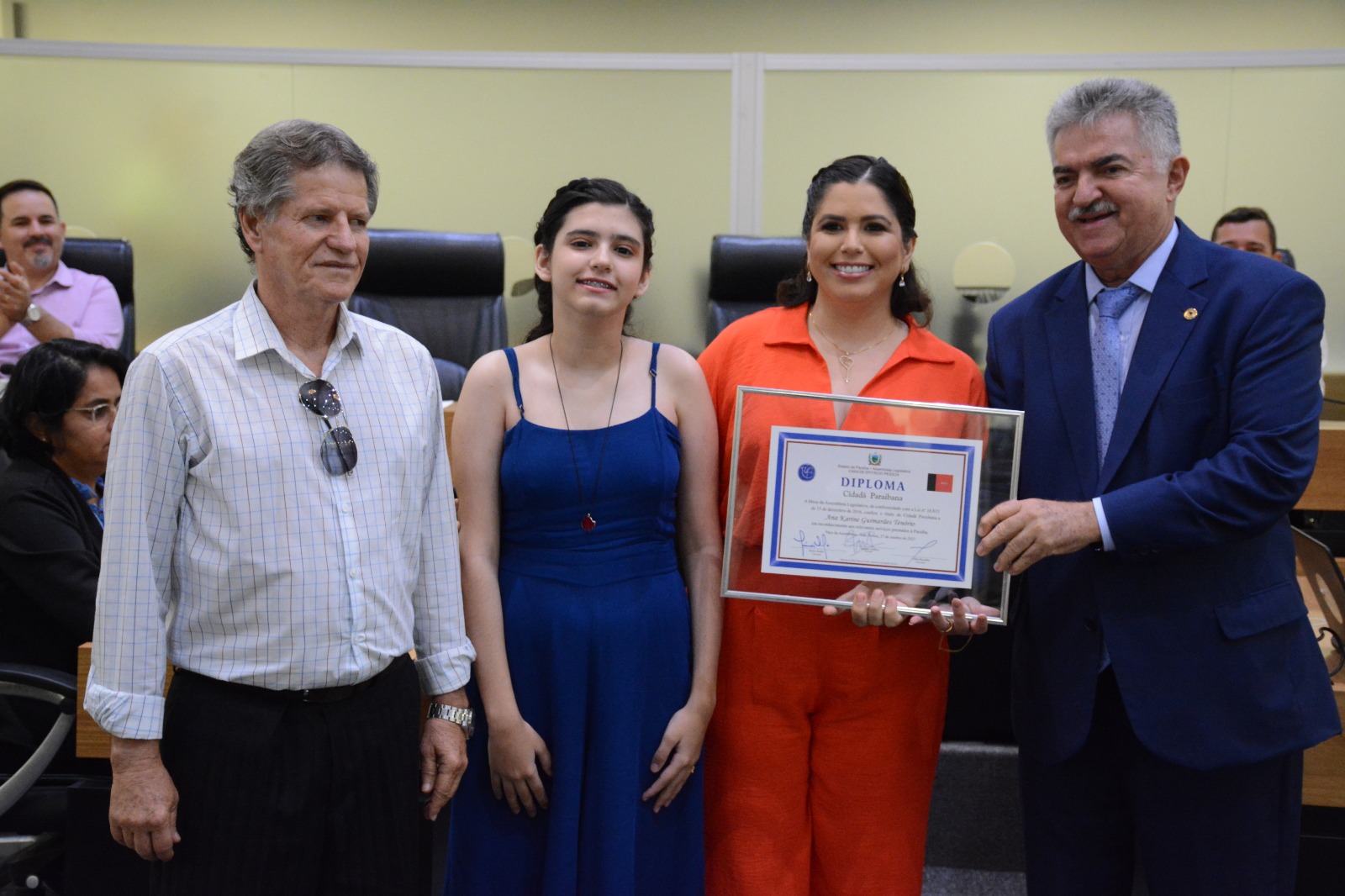 A Assembleia Legislativa da Paraíba concedeu, nesta sexta-feira (27), Título de Cidadania à jornalista Ana Karine Guimarães Tenório. A solenidade proposta pelo deputado João Gonçalves aconteceu no Plenário da Casa de Epitácio Pessoa, na sede do Poder Legislativo e contou com a presença de familiares e amigos da homenageada.