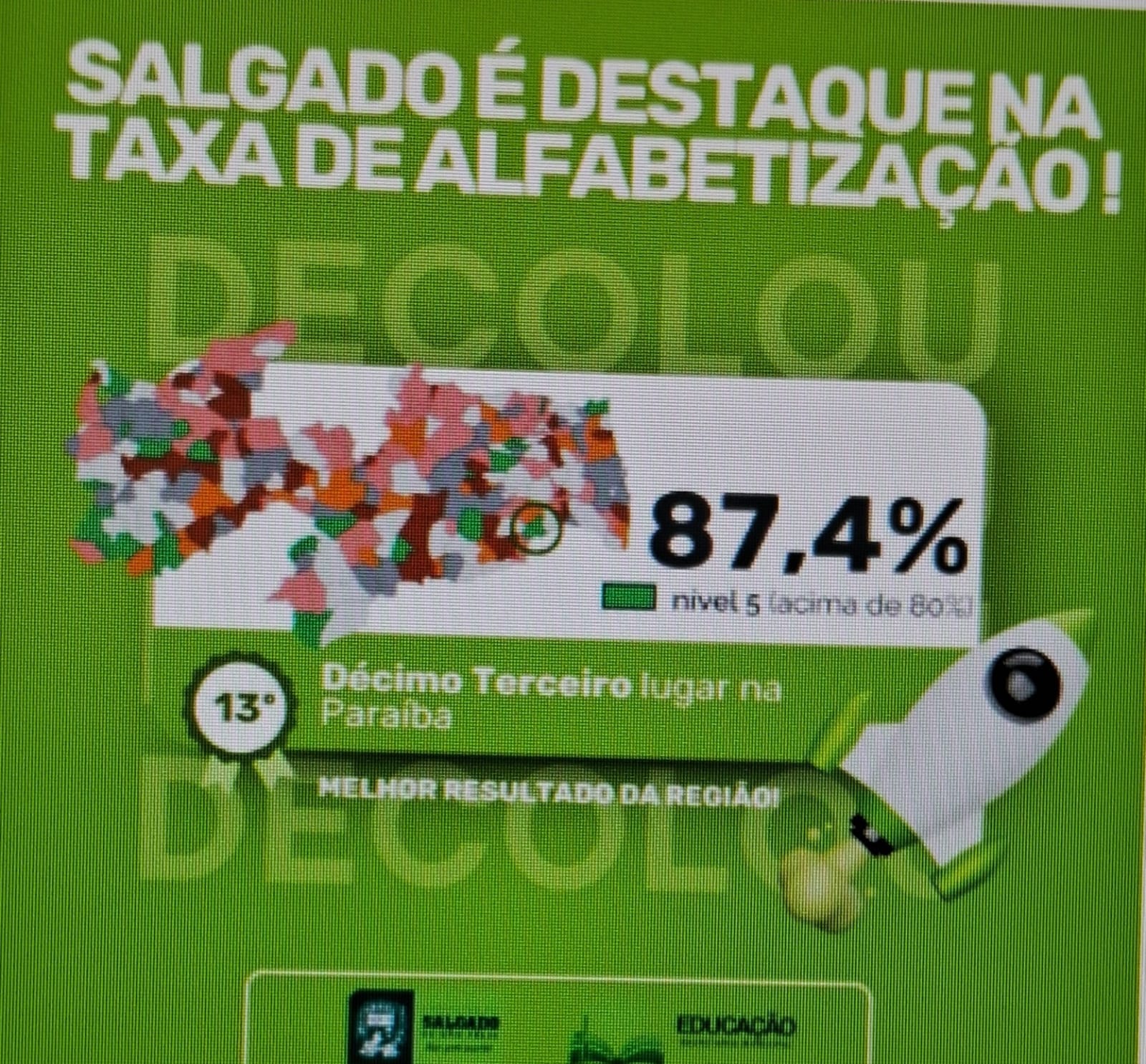 A novidade é o relatório do MC, cujo Indicador do Compromisso Nacional Criança Alfabetizada, mostra o município de Salgado de São Félix, na Paraíba, reconhecido em bem elevado daquela região. O percentual divulgado pelo MC foi de 87,4% dos alunos do 2º ano do ensino Fundamental estão alfabetizados.