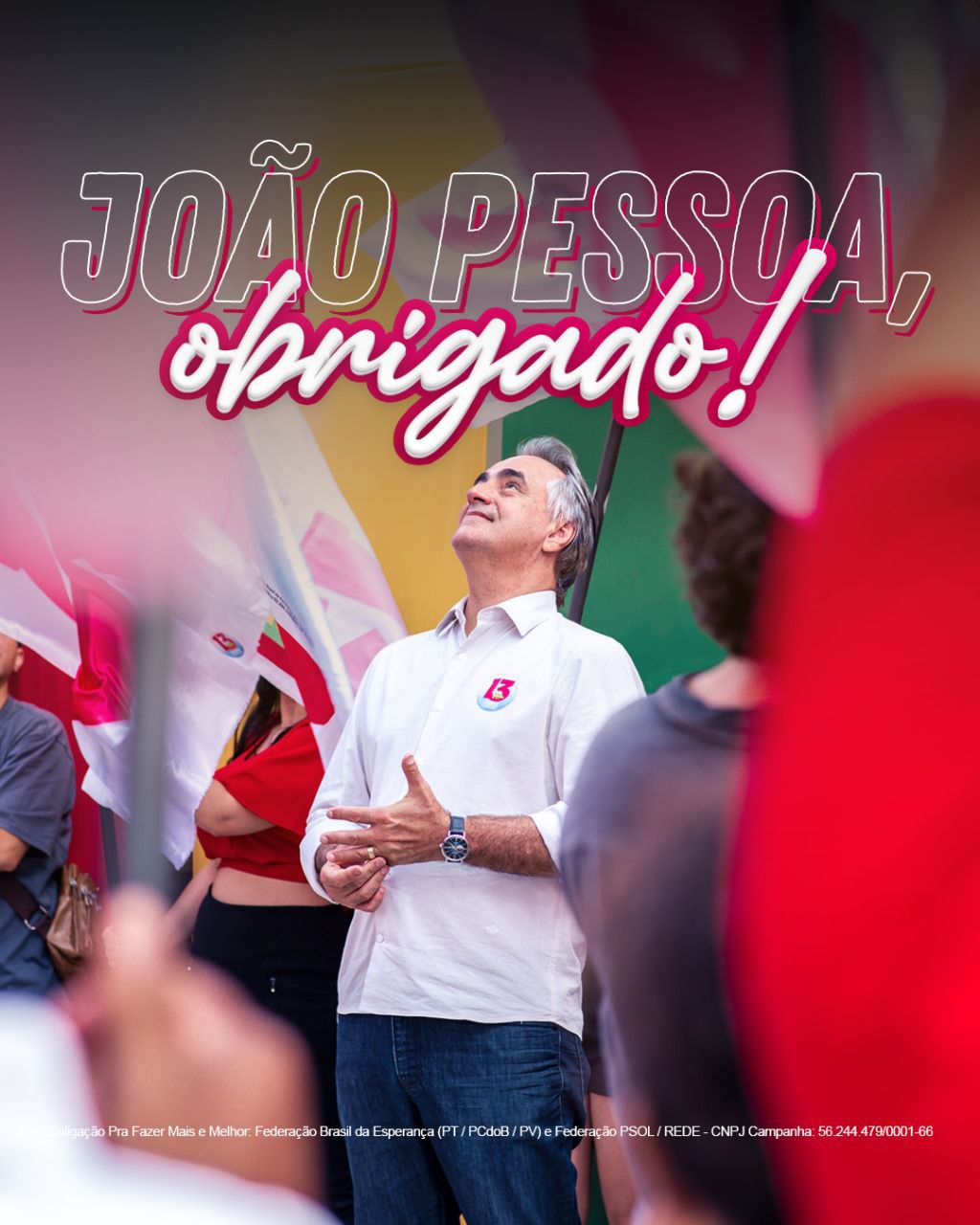 Em sua fala, ele reservou um agradecimento especial a Amanda Rodrigues, sua candidata a vice-prefeita: “Agradeço demais a nossa vice-prefeita Amanda Rodrigues, companheira de chapa e de luta, e aos companheiros e companheiras que estiveram juntos conosco nesta caminhada, candidatos a vereadores, lideranças populares e representantes dos movimentos sociais”.