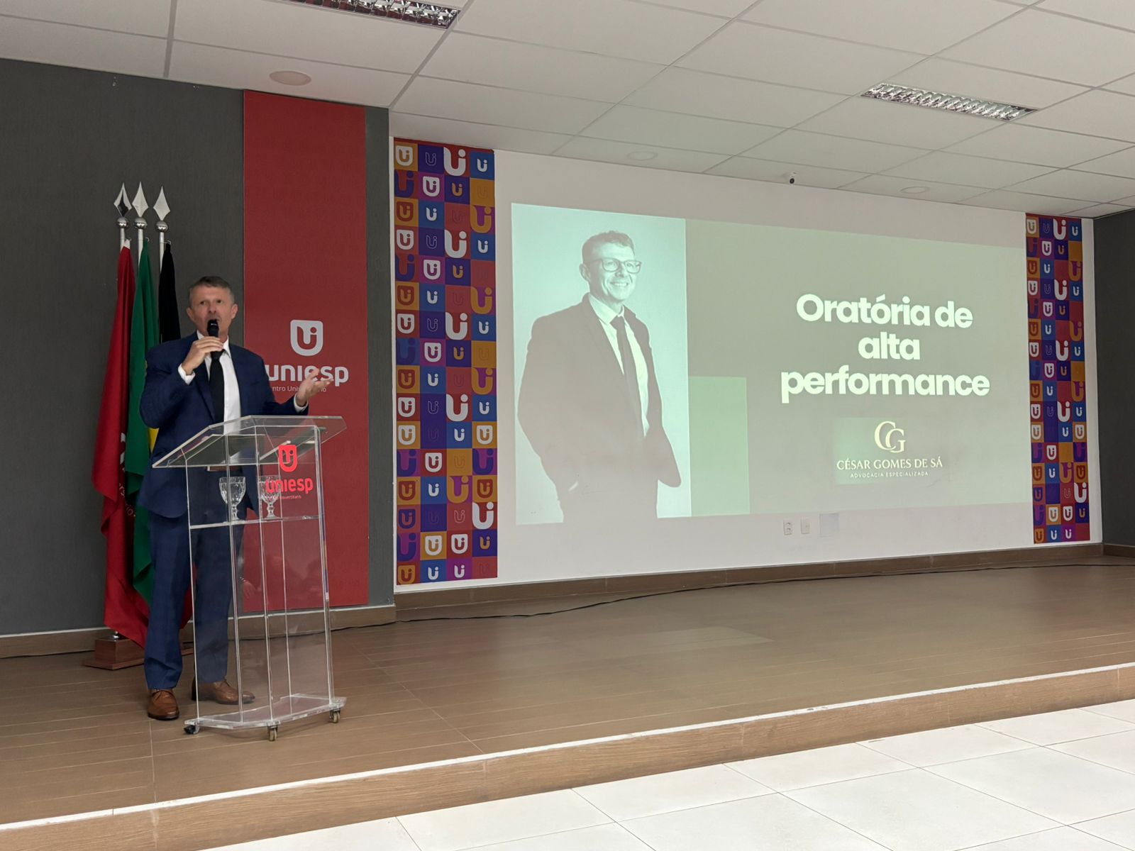 O auditório Master do Bloco Central do UNIESP – Centro Universitário, com espaços para trezentas pessoas, ficou lotado na noite dessa segunda-feira, para assistir a performance do professor carioca, César Gomes de Sá que fez explanação sobre ´Oratória de Alta Performance – A competência do presente´