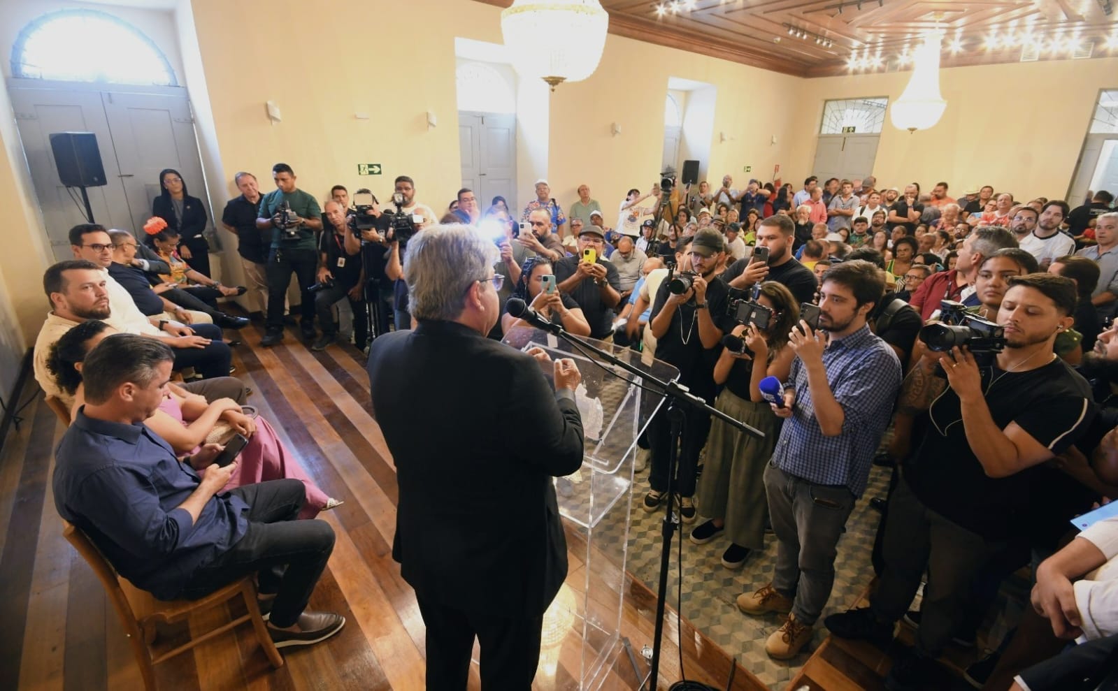 O governador João Azevêdo anunciou, nesta quarta-feira (21), o apoio do Governo da Paraíba ao Carnaval de João Pessoa — os aportes financeiros chegam a R$ 2,5 milhões e contemplam os Projetos Folia de Rua — Prévias carnavalescas, Via Folia e Carnaval Tradição, que reúne desfiles de ala ursas, clubes de frevo, tribos indígenas e escolas de samba. Essa foi a primeira solenidade que ocorreu no Palácio dos Despachos, inaugurado pelo chefe do Executivo estadual na última segunda (19).